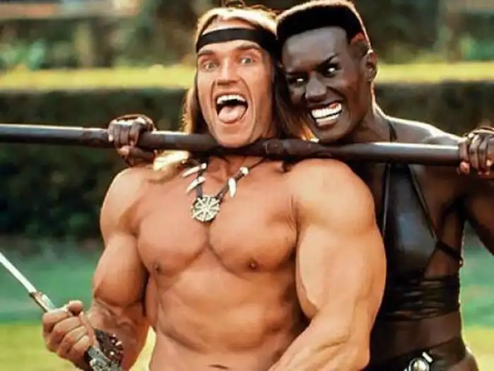 38. Арнольд Шварценеггер и Грейс Джонс на съёмках «Конан-разрушитель»