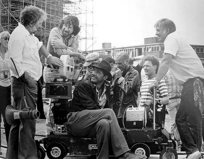 46. Дэвид Томблин, Стивен Спилберг и Харрисон Форд на съемочной площадке Индианы Джонса и Храм Судьбы . 1984 год