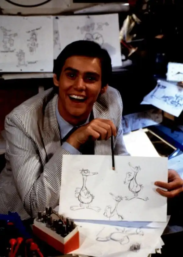 Джим Керри во время работы над своей первой главной ролью в недолговечном сериале «Утиная фабрика», 1984 год