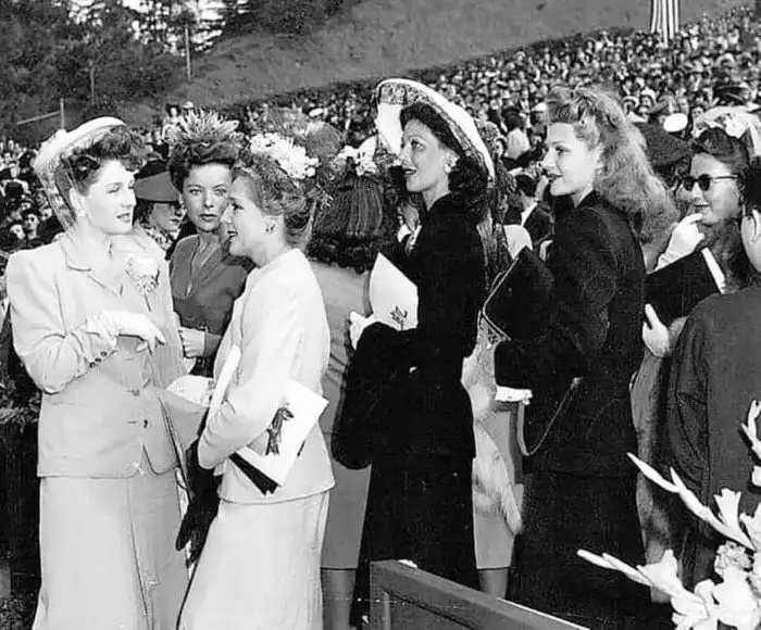 9. Норма Ширер, Ида Лупино, Мэри Пикфор, Лоретта Янг, Рита Хейворт и Барбара Стэнвик на Голливуд Боул в 1943 году