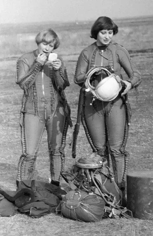 Нина Пронюшкина (с зеркалом) наносит слой гусиного жира на лицо. Установила рекорд ночного одиночного прыжка, класс G-2 FAI, с высоты - 14974 м, в свободном падении 14400 м, раскрытие купола 570 м - 28 октября 1977 г. Позже рекорд убрали из реестра FAI, как опасный для жизни.