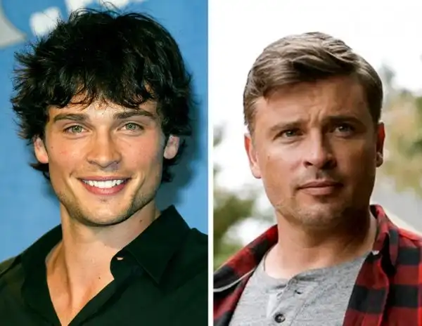 Фото слева сделано в 2002 году, когда актеру было 25 лет. Справа — кадр из сериала 2019 года «Бэтвумен», где Уэллингу 42 года.