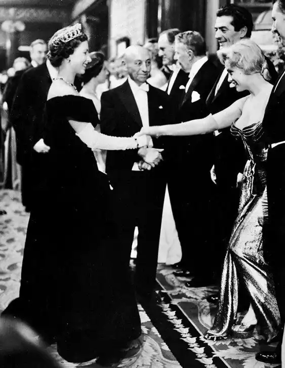 20. Мэрилин Монро приветствует королеву Елизавету II реверансом, Лондон, 29 октября 1956 года