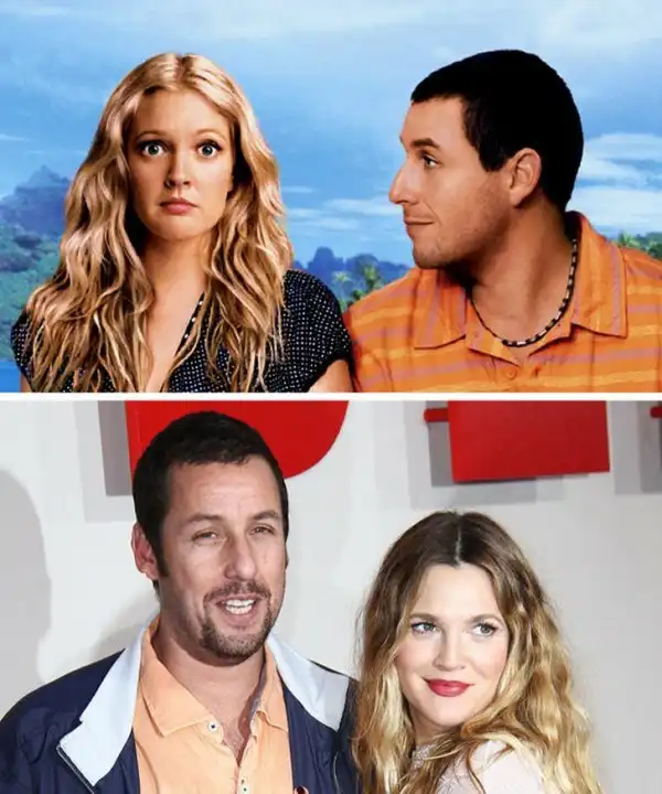 Дрю Бэрримор и Адам Сэндлер в 2004 году и 10 лет спустя