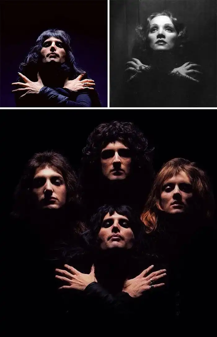 Мало кто знает, что поза Фредди Меркьюри на этом знаменитом снимке группы Queen был вдохновлен фотографией Марлен Дитрих