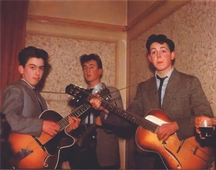 28. The Beatles, 1957 год. Джону Леннону — 16 лет, Джорджу Харрисону и Полу Маккартни — 15 лет