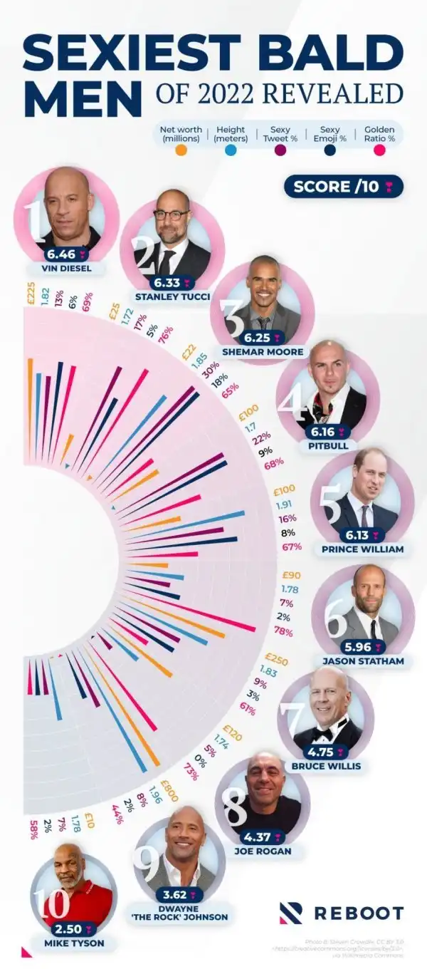 В Сети обожают составлять ТОПы, рейтинги и проводить голосования на самые разные темы. Например, британская компания Reboot решила узнать у людей, кого из лысых знаменитостей они считают самыми привлекательными. Критерии отбора были таковы: правило золотого сечения, рост, чистые активы (в фунтах стерлингов) и мнение общественности. Подсчет проводился по хвалебным постам в Твиттере и по количеству эмодзи в виде "влюбленного смайлика". Таким образом, знаменитые джентльмены с блестящей лысиной получали общую оценку по 10-балльной системе. В итоге получился вот такой народный ТОП-10, давайте поглядим.