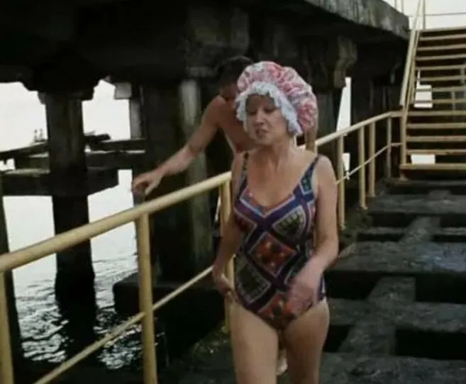 В фильме «Любовь и голуби» Гурченко шествует по пирсу в «сплошном» купальнике и смешной купальной шапочке. Для 49-летней актрисы появление в кадре в таком виде было смелым поступком.