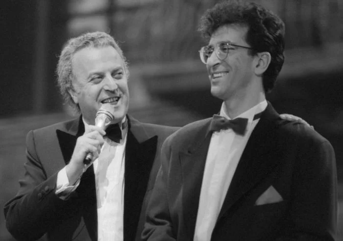 21. Илья Резник и Александр Буйнов на съемках телепрограммы «Рождественский вечер с Аллой Пугачевой», 1991 год