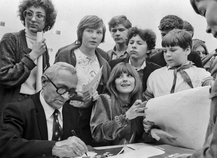 9. Георгий Милляр и Наталья Варлей раздают автографы юным любителям кино на кинофестивале в Москве, 1983 год