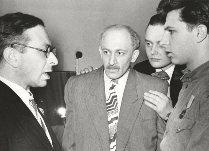 26. Виталий Виленкин, Евгений Евстигнеев, Геннадий Печников, Игорь Кваша после спектакля «Вечно живые», 1950-е годы