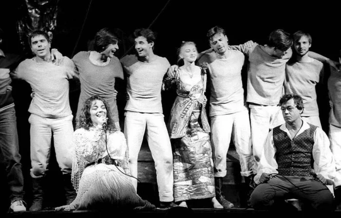 Кончита - Алена Хмельницкая. Резанов – Николай Караченцов. Справа налево стоят: Сергей Чонишвили, Денис Карасев, Александр Лазарев, Татьяна Фесенко, Дмитрий Певцов, Леван Мсхиладзе, Игорь Фокин.