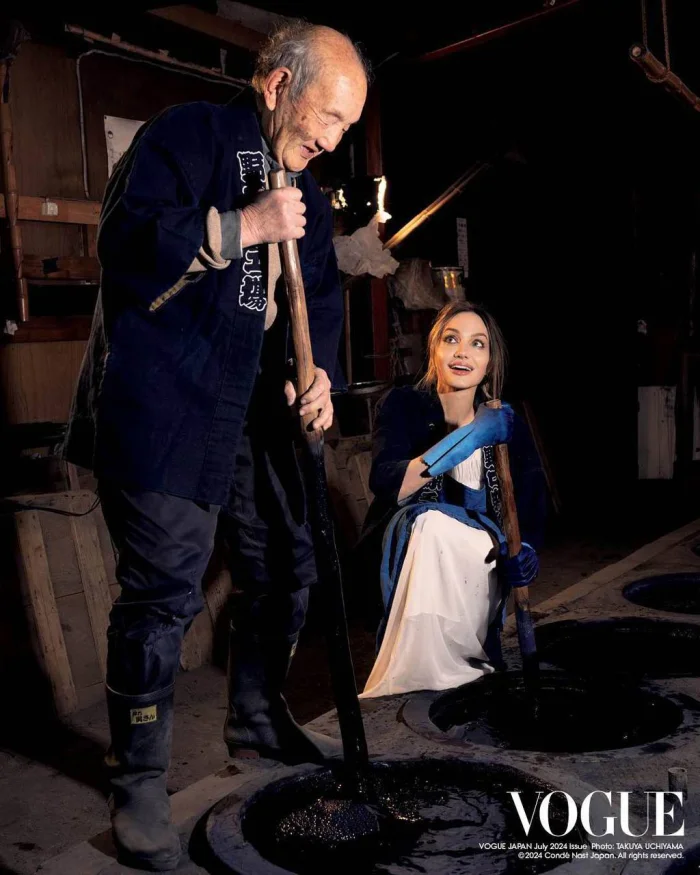 Знаменитость собственноручно покрасила платье своего бренда Atelier Jolie в цвет индиго, а также приняла участие в проекте, связанном с путешествиями "Неизвестные встречи". Джоли повторила архивный образ из весенне-летней коллекции ISSEY MIYAKE 1989 года.