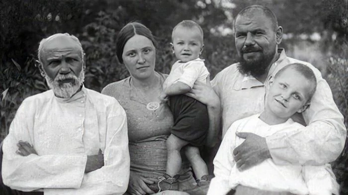 Слева направо: глава семьи Фёдор Иванович, Леонид, его мама Зинаида Панкратовна, соседка и сестра Луиза.