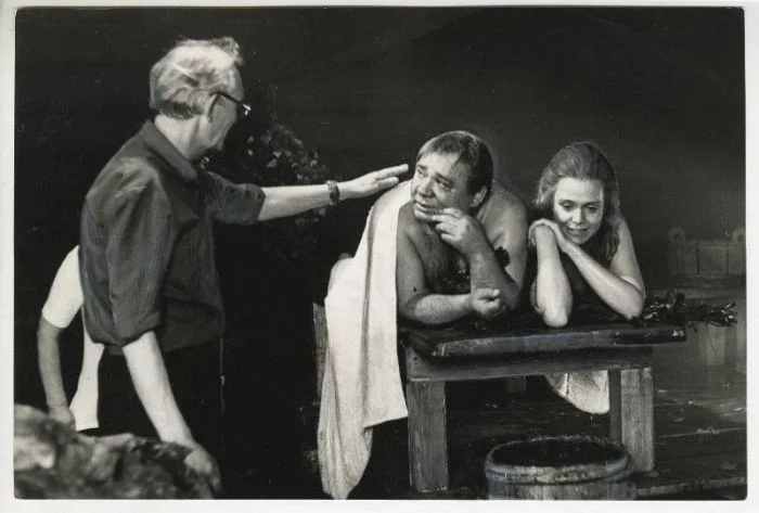 20. Леонид Гайдай, Евгений Леонов и Рита Полстер на съемках фильма «За спичками»