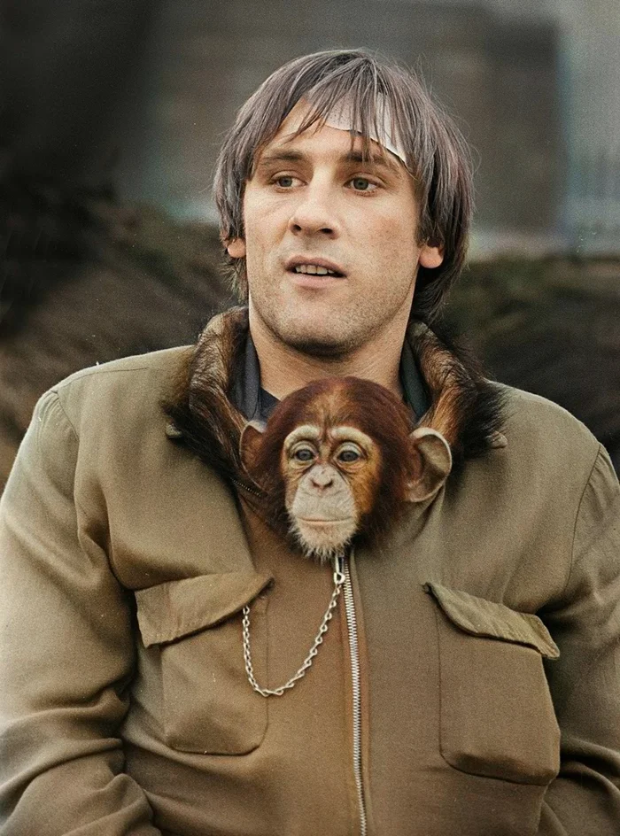 Жерар Депардье и его партнер Белла, девятимесячный шимпанзе, на съемочной площадке фильма "Прощай, самец", 1977 год.