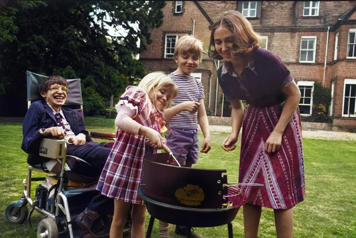 Стивен Хокинг с первой женой Джейн Уайлд и их детьми Робертом и Люси жарят барбекю, 1977 год.
