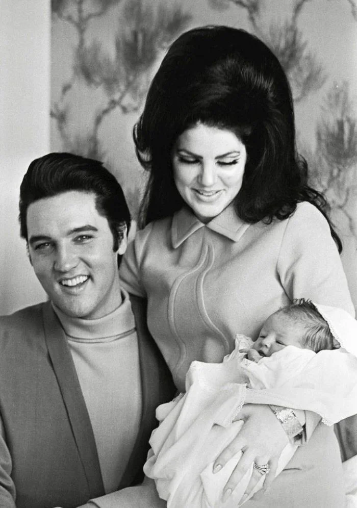 13. Элвис Пресли и Присцилла Пресли со своей дочерью Лизой Мари Пресли, 1968 год