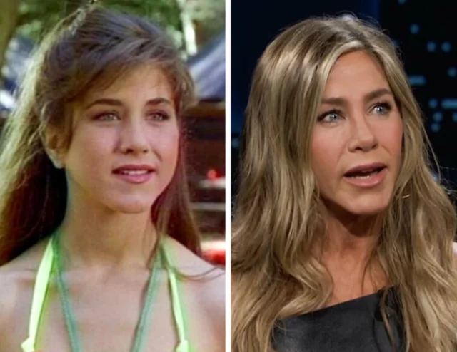 Дженнифер Энистон в фильме "Лагерь Кукамонга" в 1990 году и в 2024