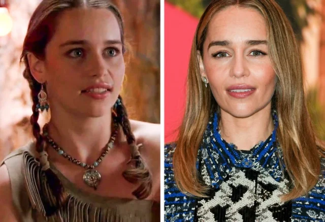 Эмилия Кларк в фильме «Атака из Триасового периода» в 2010 году и в 2023