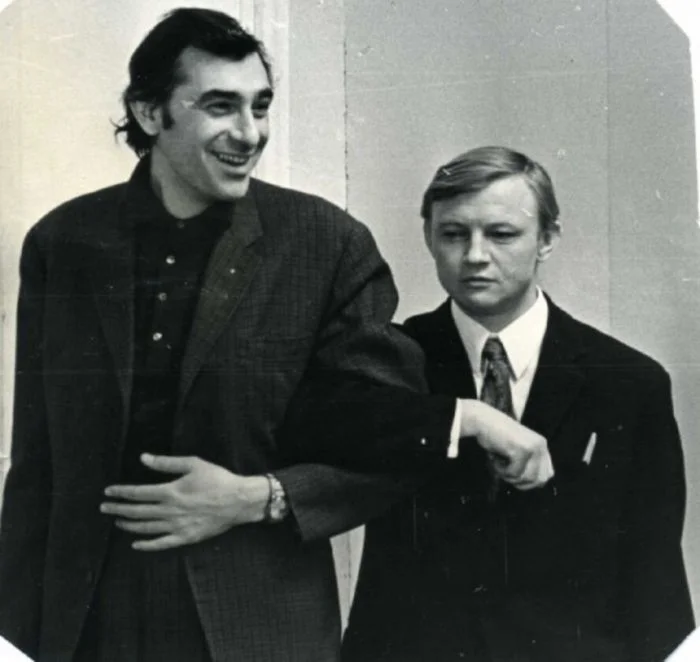 19. Евгений Евстигнеев и Сергей Юрский на съёмках фильма "Золотой телёнок".