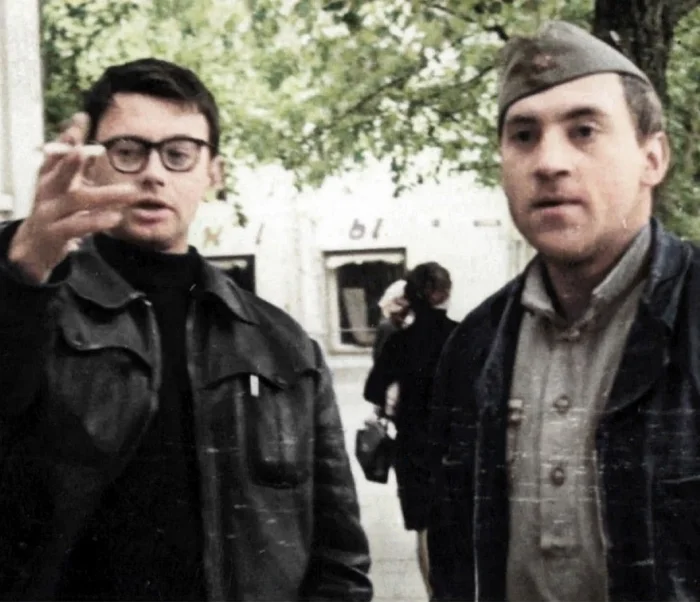 13. Александр Демьяненко и Владимир Высоцкий на съемках фильма «Война под крышами», 1967 год