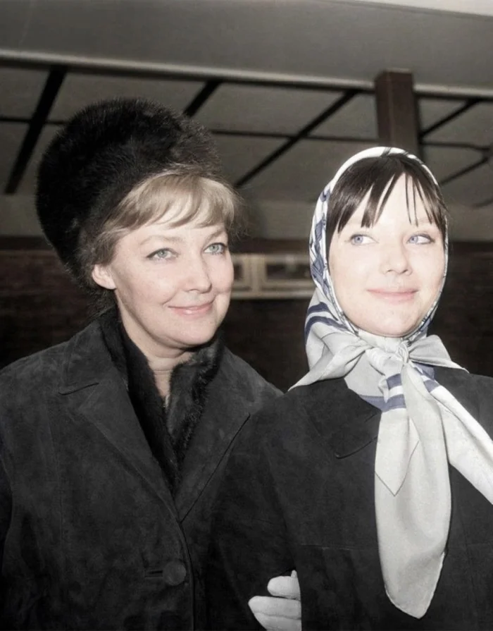 25. Ирина Скобцева и Людмила Савельева в аэропорту Хитроу (Лондон) для премьеры фильма «Война и мир», 19 апреля 1968 года
