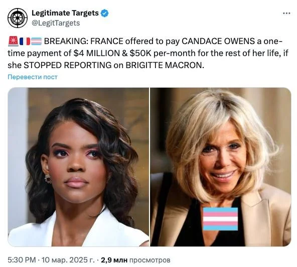 Журналистка регулярно публикует свои материалы, что вызывает серьезное недовольство как у Макрона, так и у его супруги. Недавно Кэндис Оуэнс также утверждала, что ей предлагали щедрое вознаграждение за сохранение молчания. Она отметила, что с ней встречались представители французского посольства с просьбой прекратить свои публикации.
