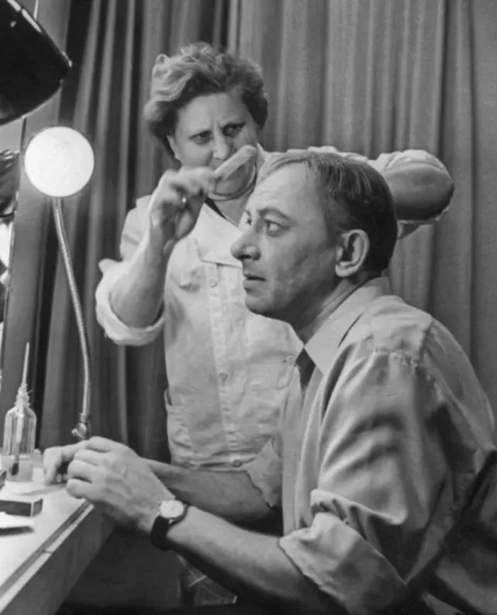 9. Евгений Евстигнеев в гримёрной перед выходом на сцену в спектакле «Сталевары», 1973 год