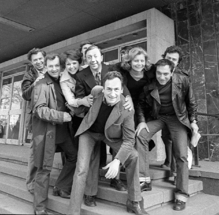 10. Французский режиссёр Антуан Витез (в центре) с актёрами Театра Сатиры на ступенях театра, 1977 год. Кого узнали, пишите в комментах…