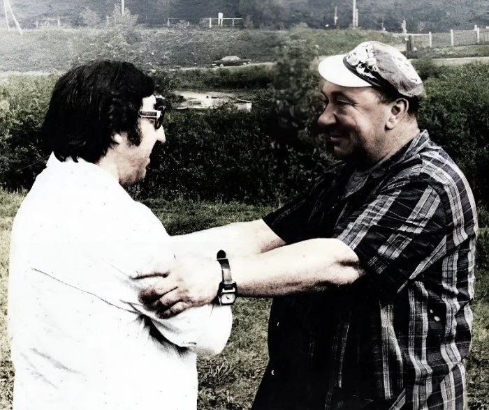 25. Фрунзик Мкртчян и Алексей Смирнов в перерыве между съемками короткометражного художественного фильма «Цена небрежности», 1975 год