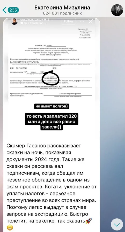 Блогер, обвиняемый в уклонении от уплаты налогов, представил публике справку из Федеральной налоговой службы за 2024 год. В документе указано, что у него отсутствуют какие-либо задолженности перед государством. Однако Е. Мизулина, не поверившая в достоверность этой информации, стала объектом критики со стороны Гасанова, который намерен исключить её из Telegram.