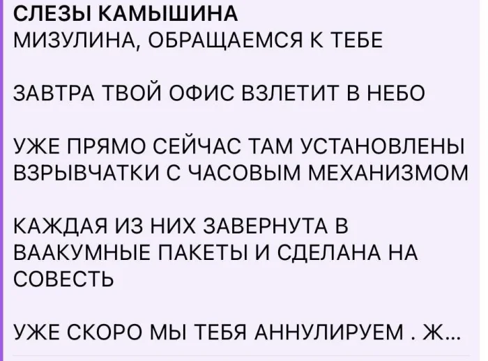 После её заявления на Мизулину обрушилась волна угроз: неизвестные пообещали взорвать её офис, утверждая, что уже установили там взрывчатку.