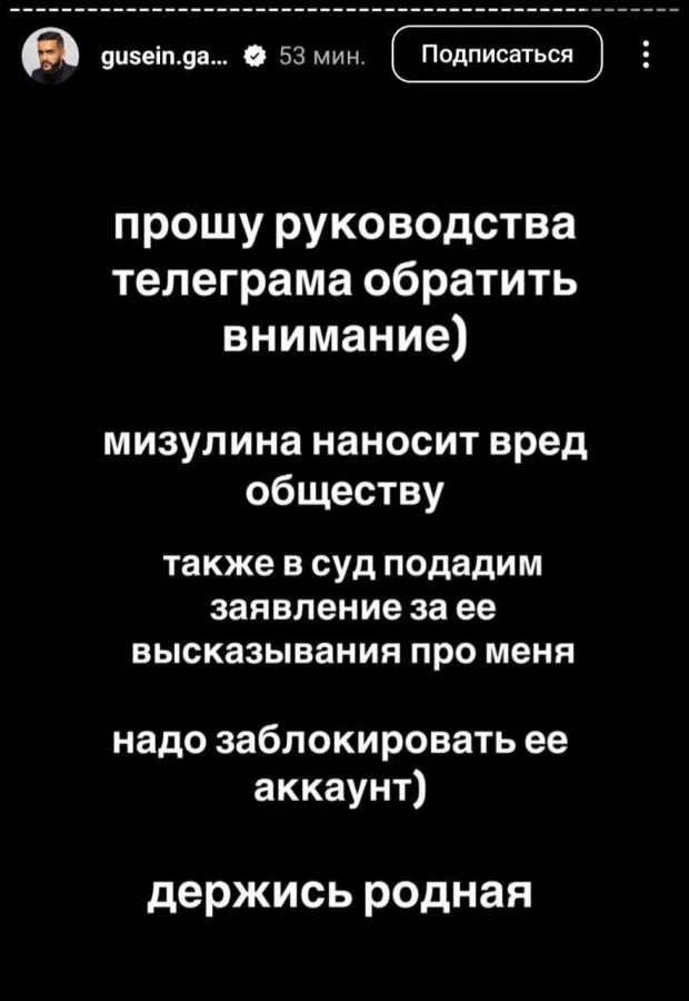 В ответ Гасанов обратился к руководству Telegram с просьбой обратить внимание на публикации Мизулиной и заблокировать её аккаунт. Он также пообещал подать на неё в суд.