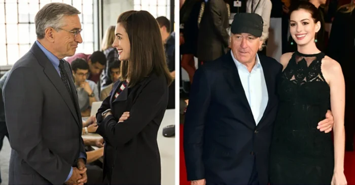 Еще один раз, когда Энн Хэтэуэй старалась не замечать стеснения актера, это фильм «Стажер» с Робертом Де Ниро. В нем Энн сыграла начальницу персонажа Роберта и по логике можно предположить, что она вполне себе может быть выше, однако по неизвестной причине Де Ниро немного удлинили. Совсем не исключено, что это было требование самого Роберта.