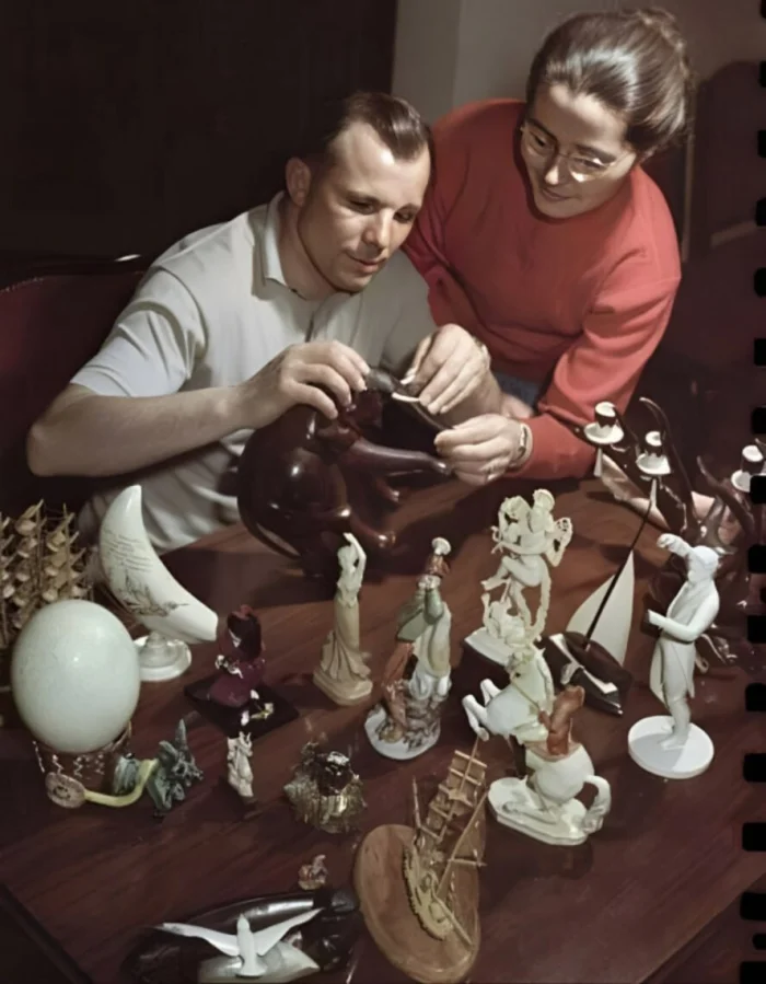 10. Юрий Гагарин и его супруга рассматривают подарочные сувениры. Москва, 1963 год