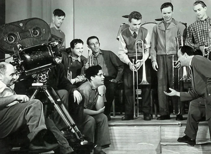 13. Эльдар Рязанов и оркестр Эдди Рознера на съемках фильма "Карнавальная ночь".