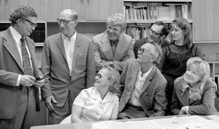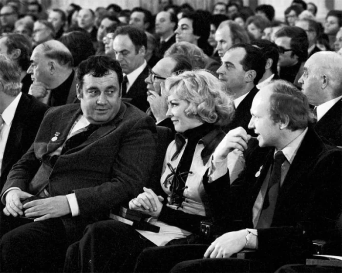 С кинорежиссером Леонидом Гайдаем и актерами Сергеем Филипповым, Михаилом Кокшеновым, Ниной Гребешковой, Людмилой Шагаловой. 1977 год, г. Москва. Фото Сергей Смирнов