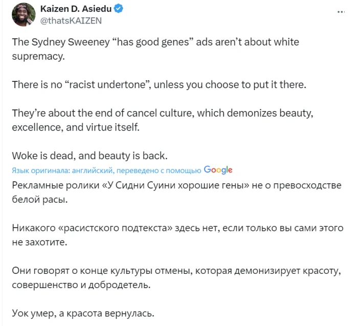 В соцсетях после рекламы про гены джинсы начался сущий кошмар. Одни требуют отменить American Eagle, Сидни Суини (те, кто раньше восхищался её красотой, теперь говорят, что она максимум 5 из 10) и заодно джинсы. Другие радуются концу эпохи воука и нахваливают Суидни Суини.