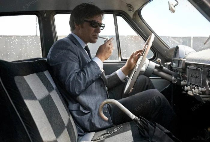Андрей Миронов за рулём своей первой личной машины — «Волги» ГАЗ-21 — в 1970 году. Автомобиль он купил на гонорар и премию за роль в культовом фильме «Бриллиантовая рука». Машина стала для него настоящей гордостью, и он много передвигался на ней по городу.