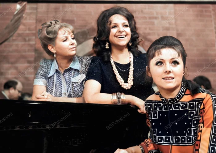 Актрисы Валентина Дмитриевна Шарыкина в роли пани Зоси, Ела Ивановна Санько в роли пани Ванды и Наталья Игоревна Селезнева в роли пани Катарины (слева направо) на съемках одного из выпусков развлекательной телевизионной передачи.