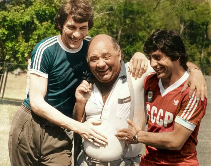 Народный артист Евгений Леонов на базе сборной СССР с футболистами Ринатом Дасаевым и Хореном Оганесяном.