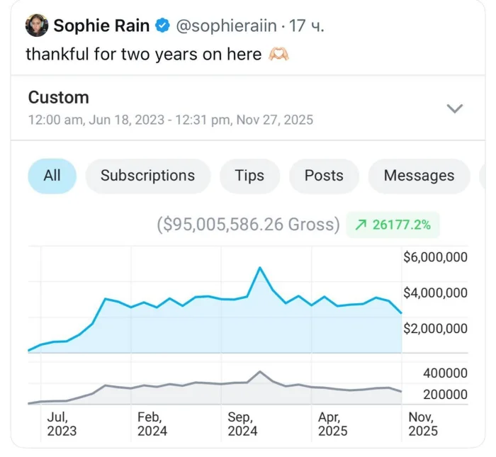 Кульминацией стала её публикация 28 ноября 2025 года в соцсети X (бывший Twitter). Софи выложила скриншот аналитики OnlyFans с подписью «Благодарна за два года здесь» — на графике за период с июня 2023-го по ноябрь 2025-го значилась астрономическая сумма: 95 005 586,26 доллара валового дохода. В пересчёте по курсу на момент публикации это почти 7,5 млрд рублей. В среднем за два с небольшим года она зарабатывала около 3,4 млн долларов в месяц, а её рост по внутренней статистике платформы превысил 26 000%. Скриншот моментально разлетелся по медиа и породил сотни комментариев от людей, которые задавались логичным вопросом: «Зачем мы вообще ходим на обычную работу?»