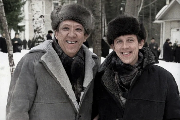 Юрий Никулин, Евгений Моргунов и Георгий Вицин во время озвучки персонажей Балбеса, Бывалого и Труса для аудиосказки «Происшествие в стране Мульти-Пульти», 1981 год.