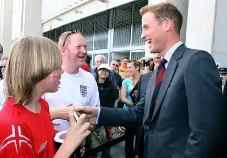 Prince William meets England fans outside the Waldstadion in Frankfurt, Germany, where the England team start its World Cup campaign against Paraguay on Saturday June 10, 2006.