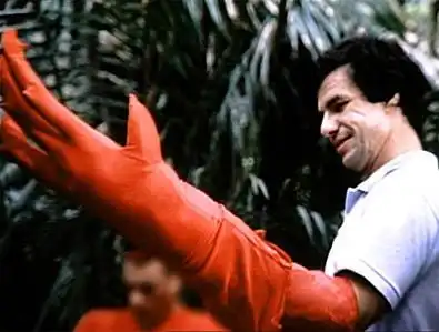 На первом плане Джон МакТирнан забавляется с фрагментом красного костюма, использовавшегося в сценах, когда Хищника нужно было сделать мерцающим. Интересно, что студия так обиделась на Ван Дамма, что ни разу не упомянула его имени в титрах, а на этом снимке стоящего на заднем плане артиста даже размыли. Но все равно его лицо прекрасно угадывается. Надо сказать, сей факт участия в съемках знаменитого боевика скрыт и в биографии самого Жан-Клода, урожденного Ван Варенбурга - видно, удовольствие играть на подпевках у Арнольда да еще, скрытого под маской инопланетного уродца - факт для мегазвезды, коим стал нынче Ван Дамм - позорный.