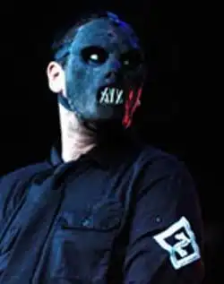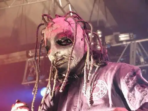 Кори Тейлор. Изначально это была кованная маска с дредами из собственных волос. Сейчас маска Кори закрывает не всю голову, а только лицо. Она темно-зеленого цвета прошита нитками и скобами. Дредов больше нет и он красит свои волосы в красный и фиолетовый цвет, что бы она лучше смотрелась...