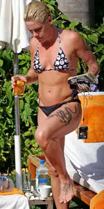 Загорает, купается и позирует перед камерами белокурая «королева бюста» в классических однотонных моделях, с неизменной золотой цепью на бедрах.