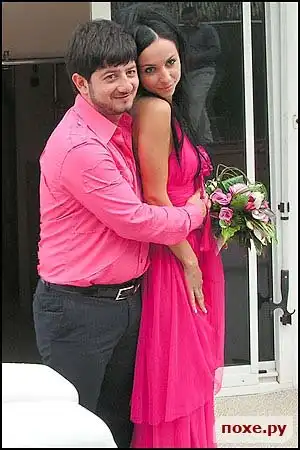Первыми из чудо-авто вышли родственники влюбленных, а потом показались и сами жених и невеста. Свадьба эта была не совсем обычной: на невесте было совсем не традиционное белое платье, а яркий наряд темно розового цвета. Жених же был в розовой рубашке.