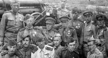 Победу Никулин встретил в Прибалтике. Однако домой по пал не скоро. Демобилизацию проводили в несколько этапов, и до него очередь дошла только через год после окончания войны. Он уволился из армии 18 мая 1946 года.Батарея Юрия Никулина (в первом ряду, второй слева)«Вас вряд ли будут снимать в кино…»